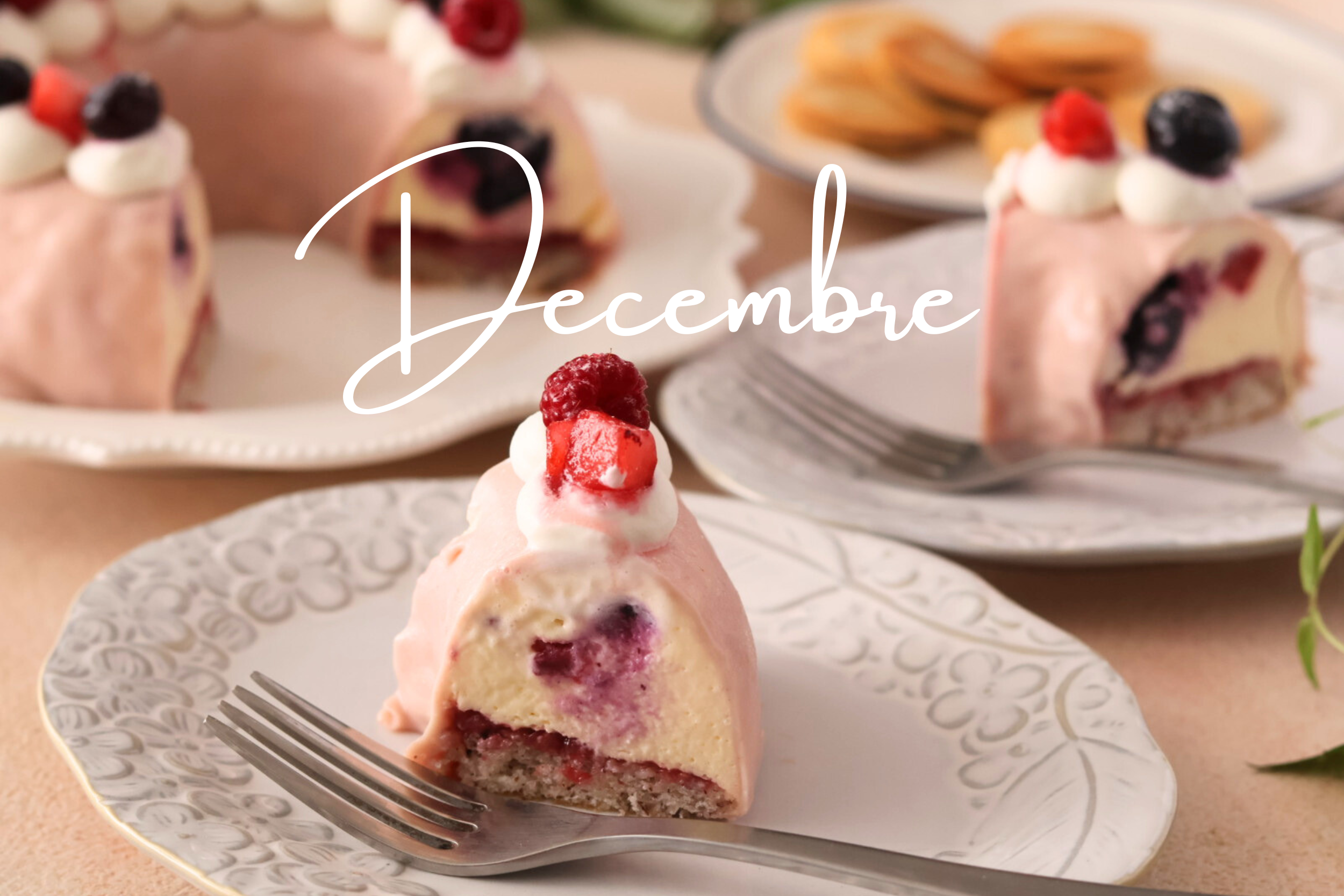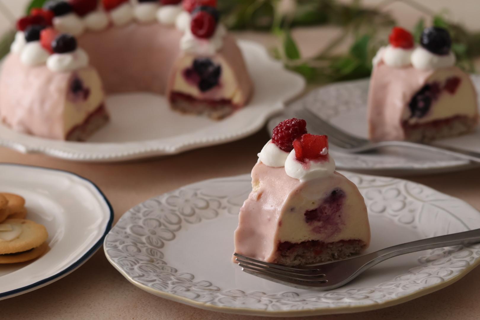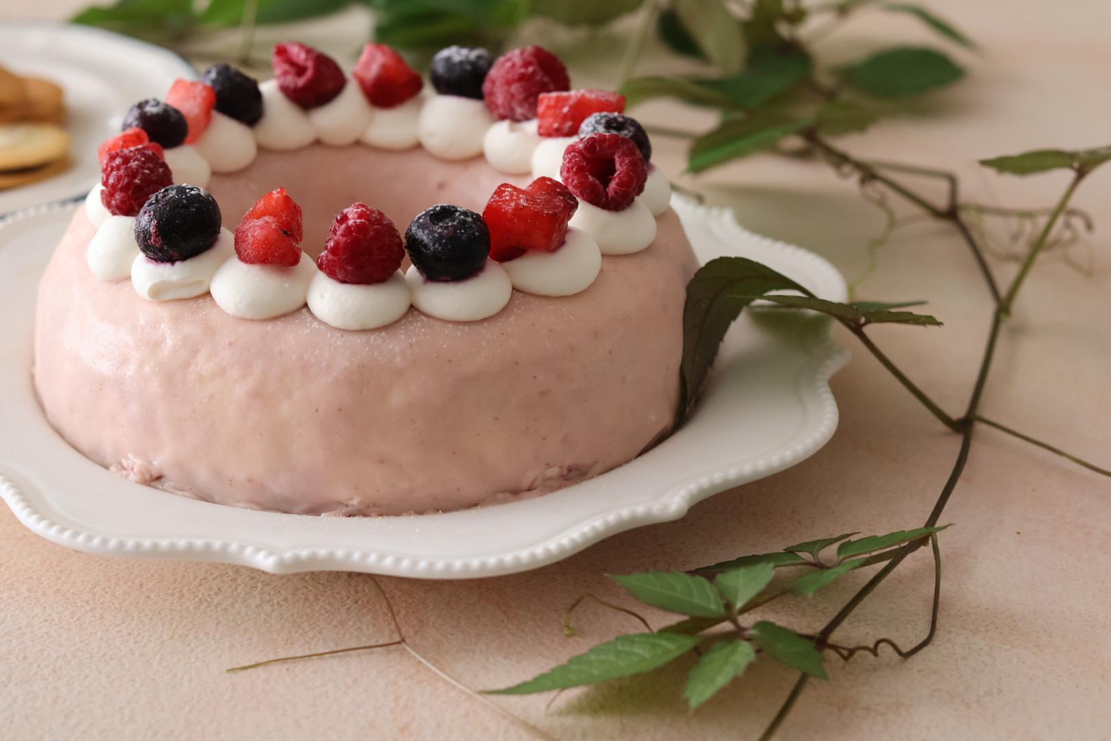 とてもさっぱり濃厚なギリシャヨーグルトムースに、苺、ラズベリー、ブルーベリーを中にいれて固めます。土台にはコクのあるヘーゼルナッツのダックワーズを。