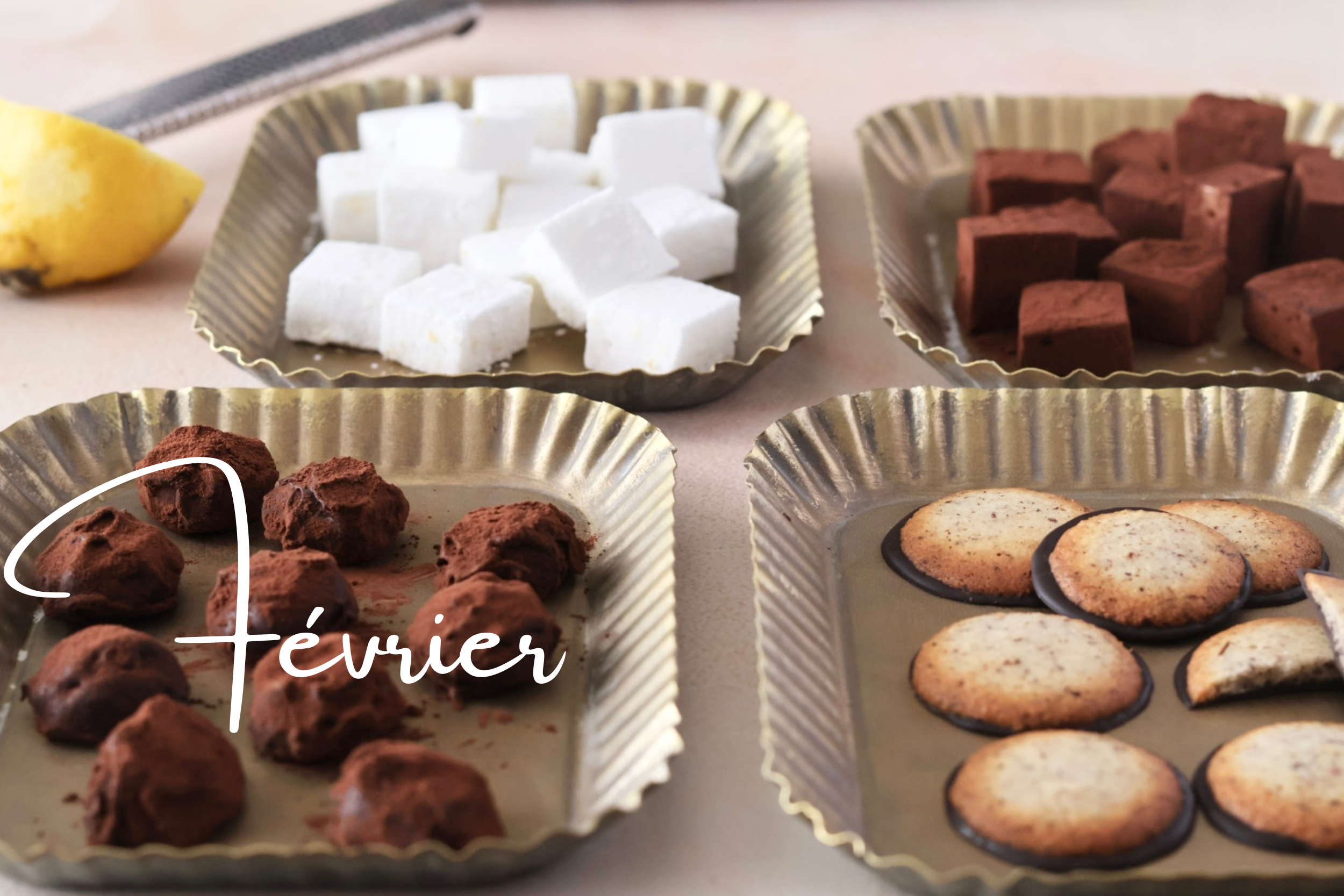 ギモーブショコラ15個、ギモーブシトロン15個、トリュフ10個、ヘーゼルナッツクッキー10個
